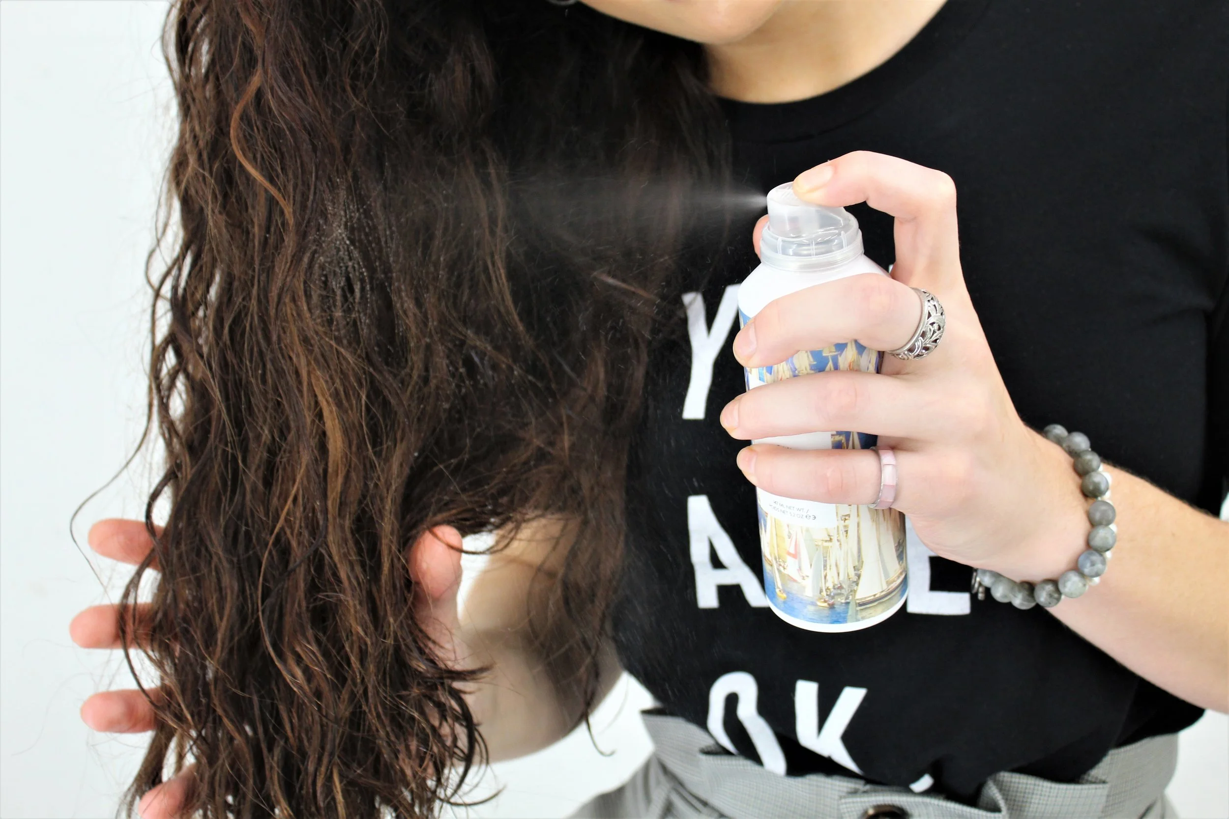 Mist R&Co SAIL soft wave spray all over your hair and scrunch in. This will set your curls and will also lay down any frizz created from blow drying.